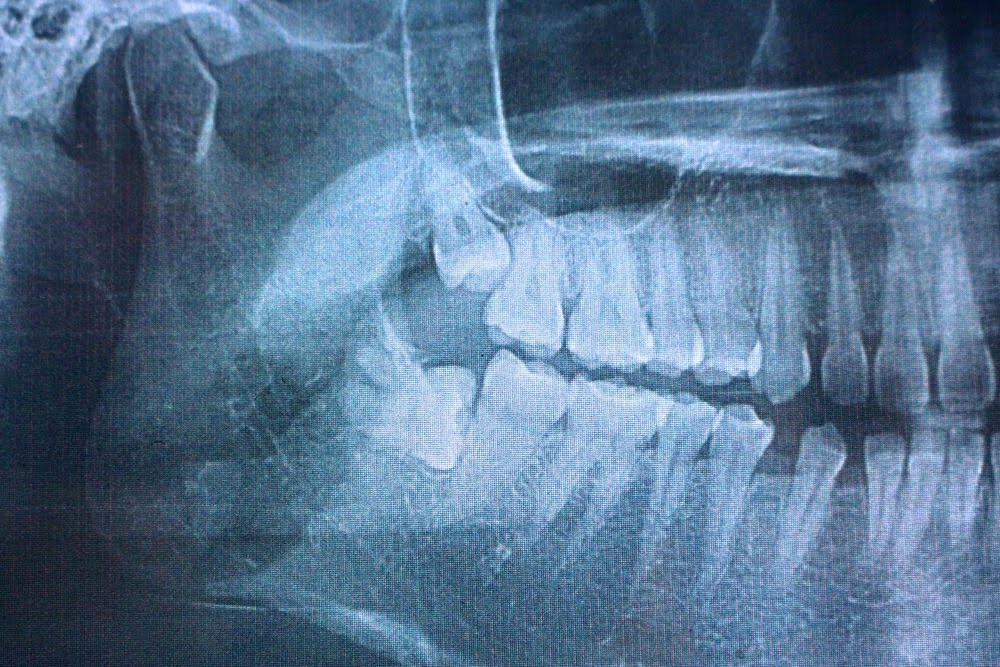 - Cysts or pockets of fluid forming around an impacted tooth